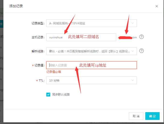 2、點擊添加記錄后,根據所彈窗給出的框條寫上即可,記錄類型選擇A即可,主機記錄可以看旁邊的一個問號有所提示,根據自己所需填寫,最后就是記錄值,填寫你的服務器IP或者空間IP即可,在確定就完成了二級域名設置。