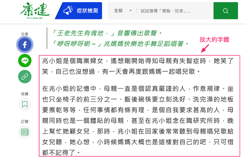 網站不是圖就是文,圖片就是一張圖,但文字沒那么簡單,文字需要編排,需要注意的事項:文字字距、行距、字體大小、文字字數、標題顏色、靠左靠右靠中、標點符號、換行字數、文字段落留白、編排一致性…,光是文字編排得好,就會有好的設計呈現,文字多的網站更應該重視文字邊排,可以多看一些有做文字編輯的網站,像是天下雜志、康健雜志、商業周刊…,這些網站對于文字編排都具備標準化與整體感,非常值得參考。文字編排很重要,舉一個文字閱讀不友善的例子,很多網站文章每一行的字數都很寬,中文字數都超過50個字以上,字數超過人類的可視角,看完一行要換到下一行會對不準,這就是符合人類閱讀的設計,控制單行在45~55個中文換行是較容易閱讀的換行字數。文章的行距太擠,會難以閱讀,最好的行距是字高的30%~50%之間。字大小的使用也不是越大越好,字過大有粗糙感,文青風網站很愛用小字表現質感,但也苦了老花眼的長輩,文字大小應該要依據網站特性適時的微調通用的字體,像是康健網站字體有刻意放大,因為網站有更多的中老年瀏覽者。